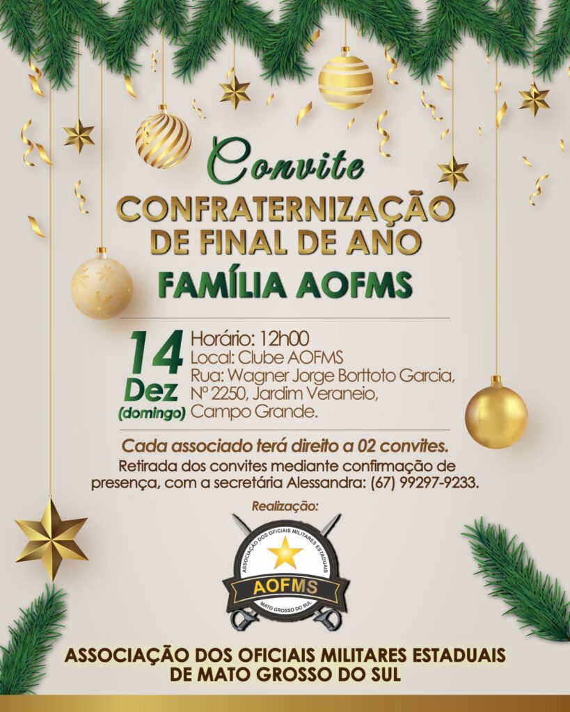 A Associação dos Oficiais Militares Estaduais de Mato Grosso do Sul (AOFMS) tem a honra de convidar seus associados e familiares para o tradicional evento de Confraternização de Final de Ano.